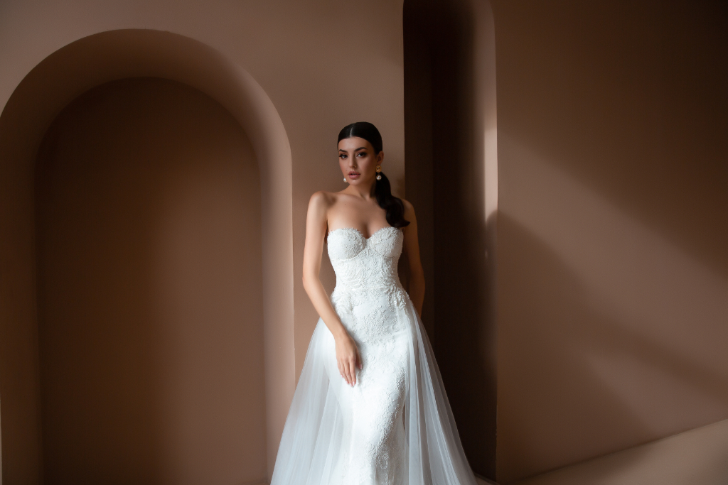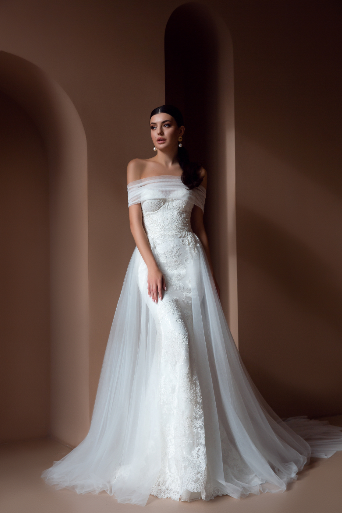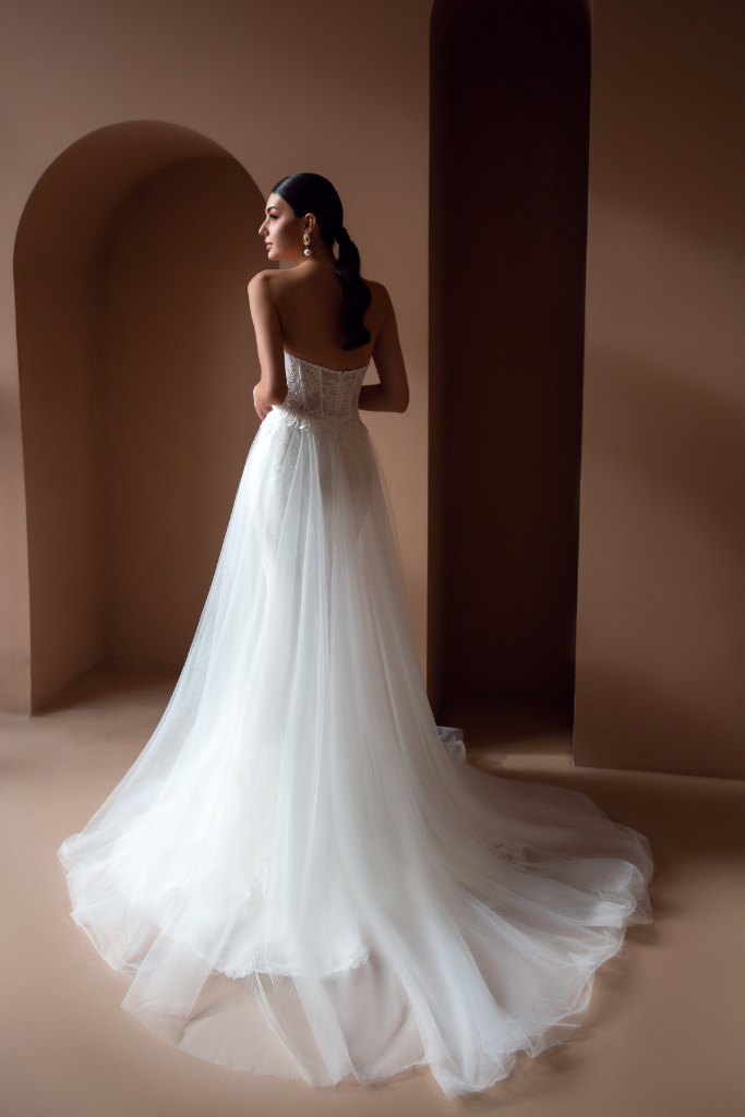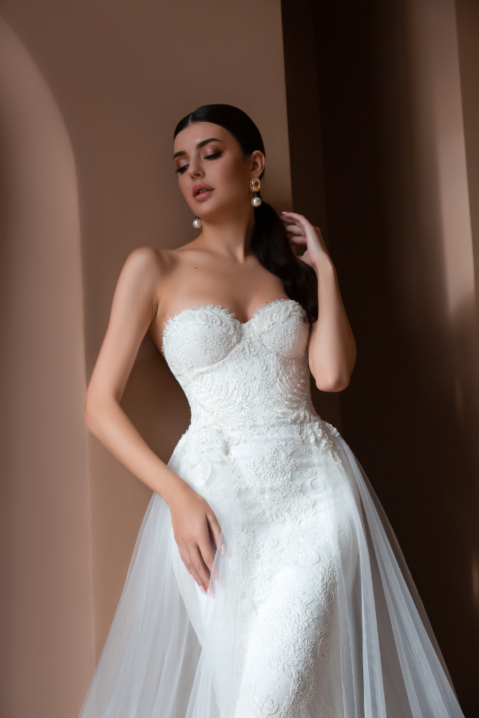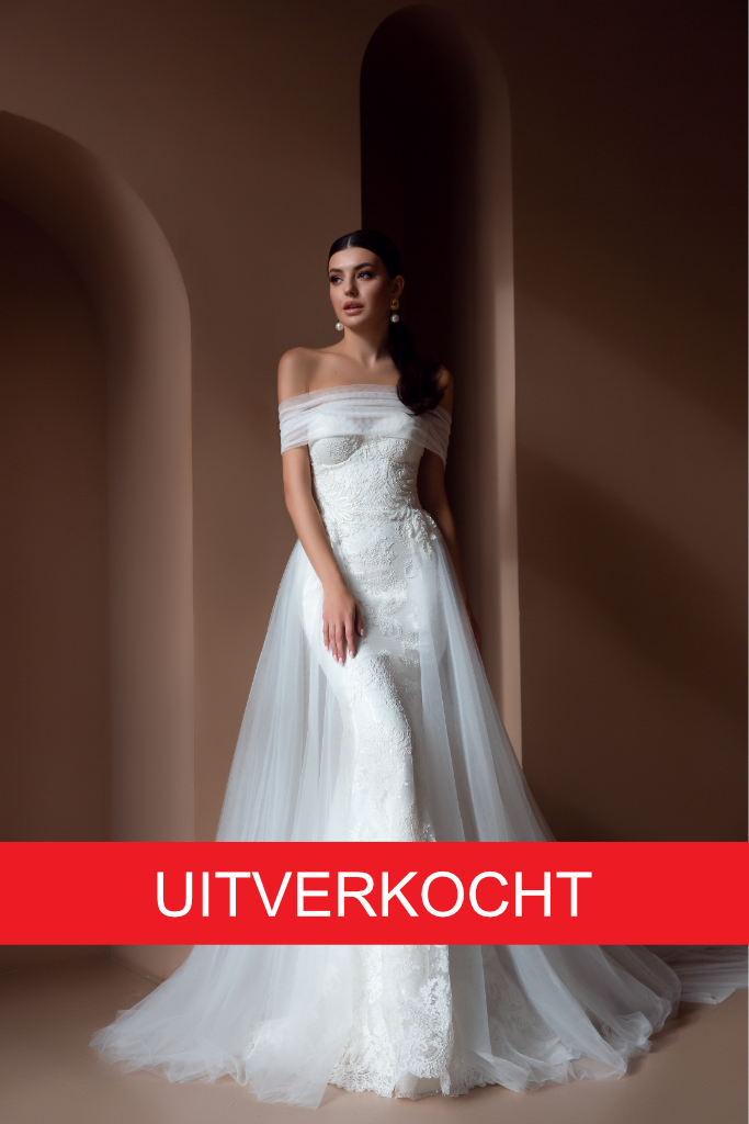 Het prachtig bekraald kanten korset is aan de randen afgewerkt met pareltjes. Ook de rand van de rug is afgewerkt met pareltjes. De kanten rok met mermaid silhouet wordt afgemaakt door de lange tule sleep.