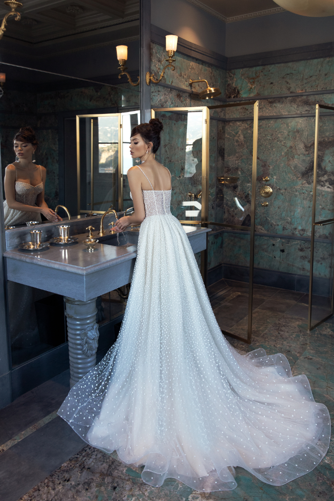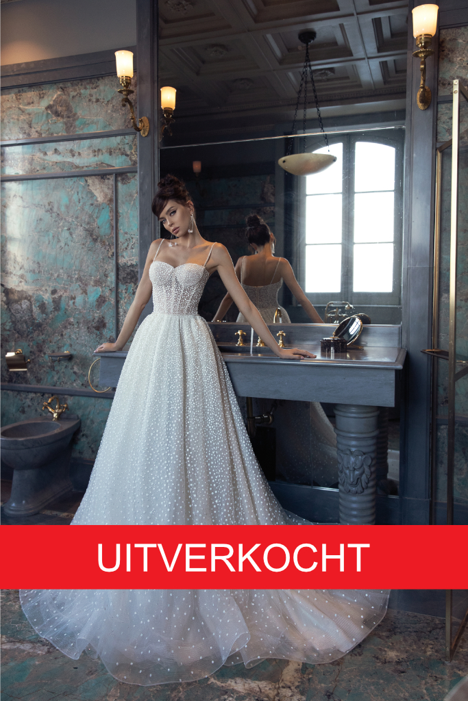 Speelse trouwjurk met een transparant korset en fijne spaghettibandjes. De rok heeft meerdere lagen tule. De glitter applicaties over de gehele jurk maken dit een zeer speciaal en een stijlvol model