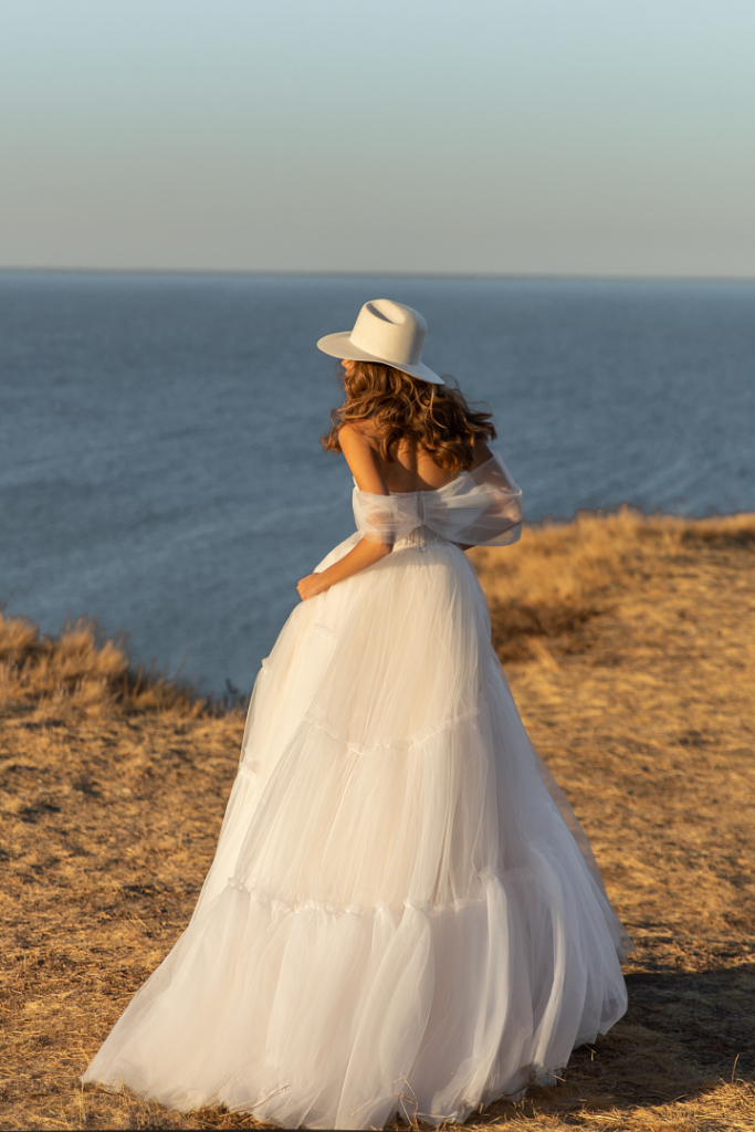 Deze trouwjurk heeft een semi transparante top met een diepe v-hals en diepe v-rug en is afgewerkt met bloemetjes applicaties. De applicaties lopen gedeeltelijk over op de tule rok.