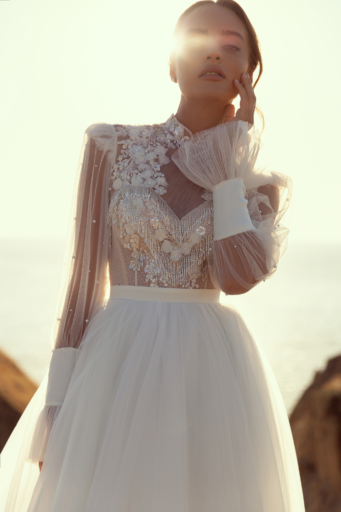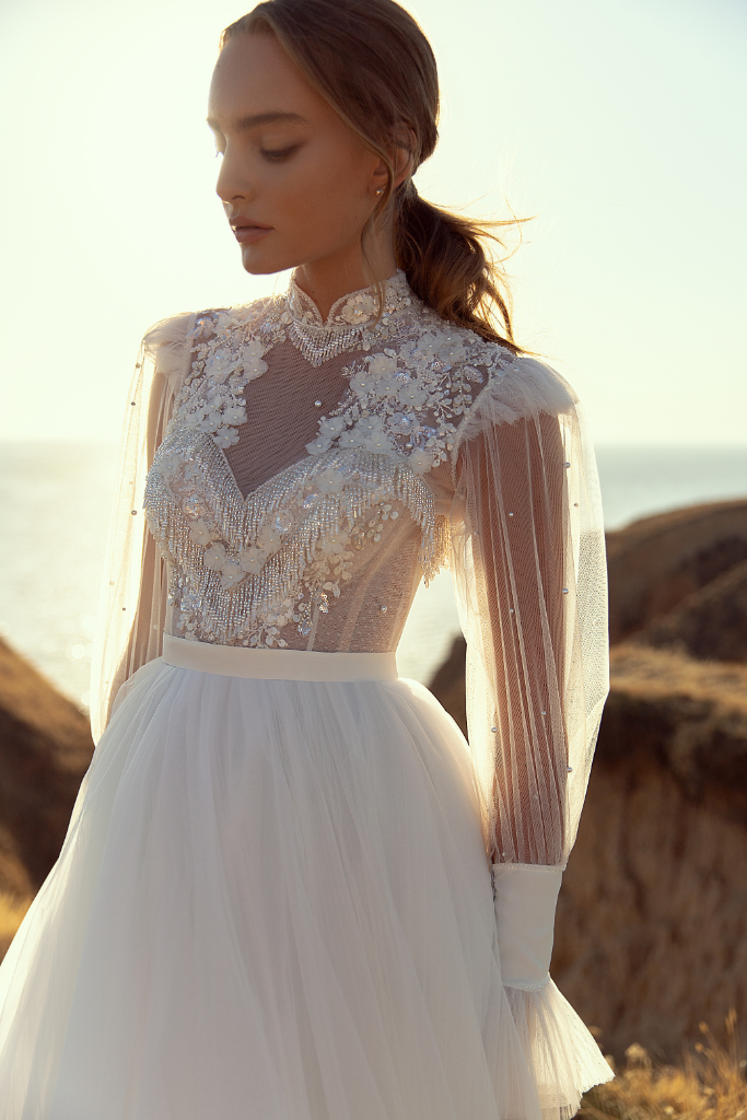 Deze bohemian trouwjurk heeft een illusion top met boordje en is afgewerkt met franjes van pareltjes en bloemen applicaties. De bijzondere mouwen zijn afgewerkt met pareltjes. De rok heeft meerdere lagen tule.