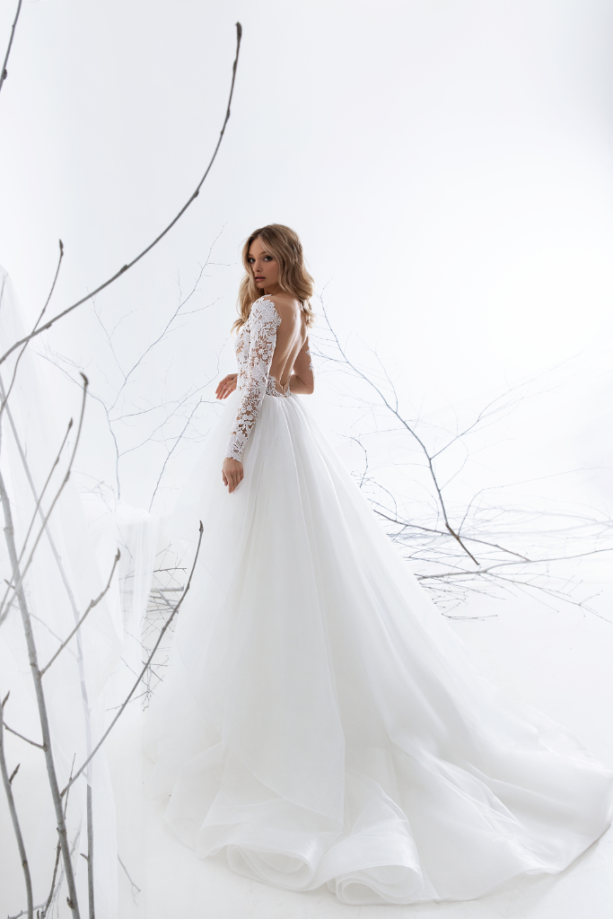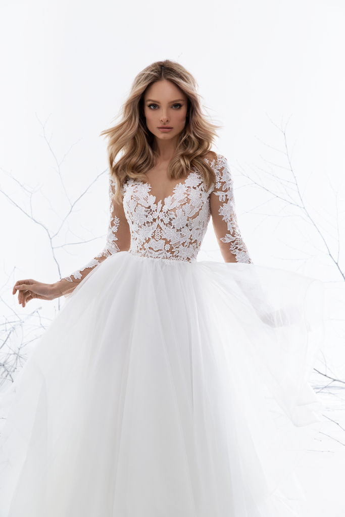 De transparante top is bedekt met kant en heeft een diepe rug. Het kant loopt ook over in de lange mouwen. De rok heeft meerdere lagen tule en de zijkanten lopen uit in ruches.