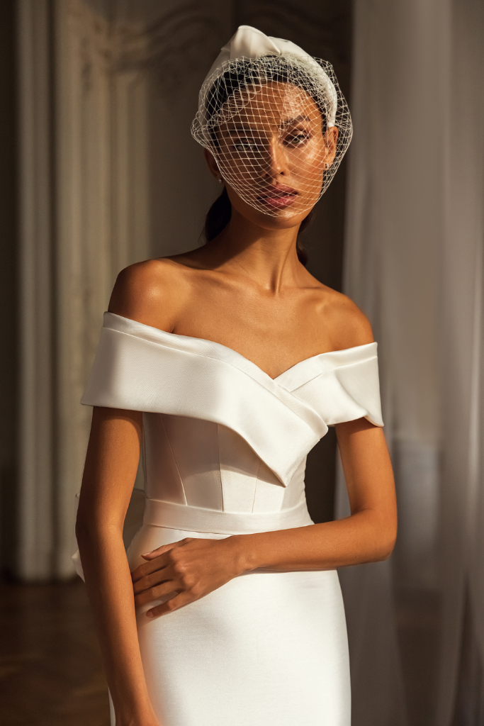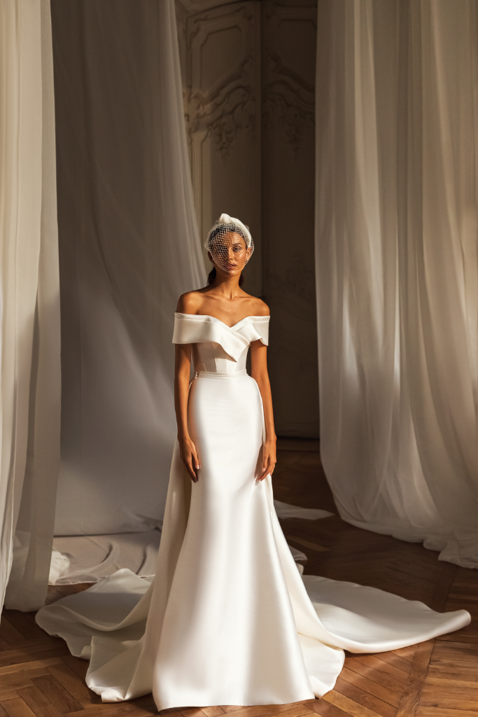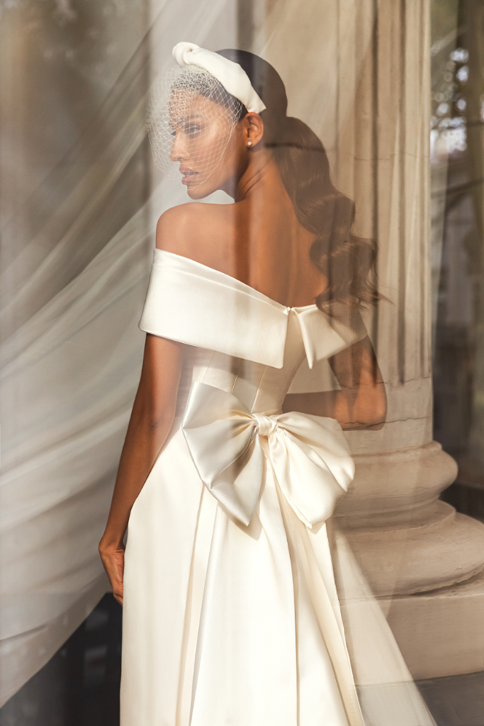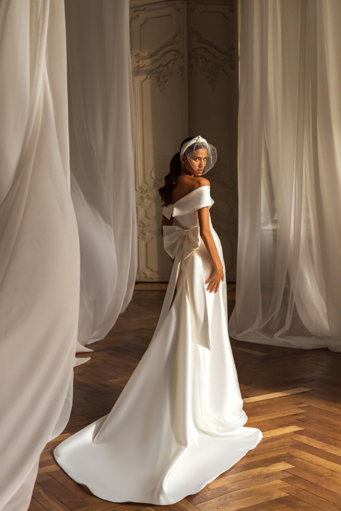 Klassieke satijnen trouwjurk waarbij de off shoulder mouwtjes uitlopen in een subtiele v-hals. De gladde rok heeft een afneembare strik en lange sleep