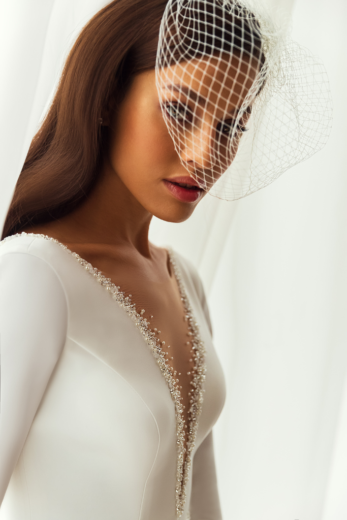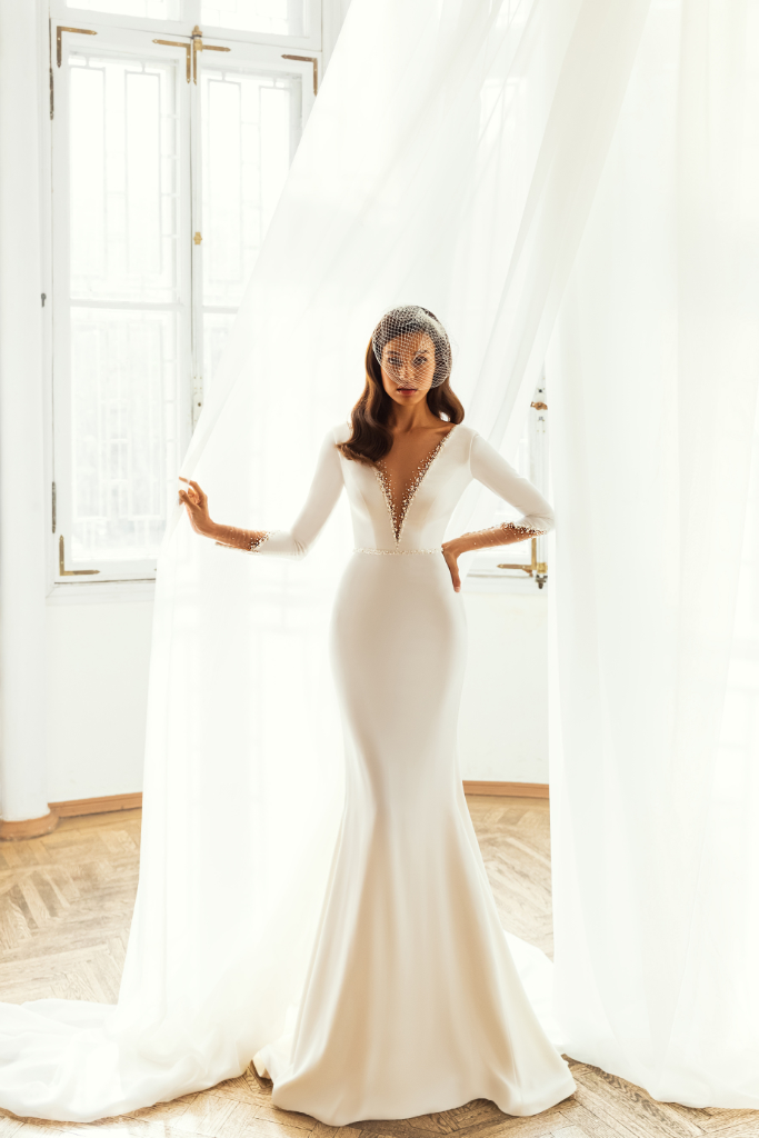 Deze satijnen jurk heeft een mooie diepe illusion v-hals die afgewerkt is met kralen en pareltjes. De diepe rug en mouwen hebben dezelfde afwerking. De gladde rok heeft een sleep.