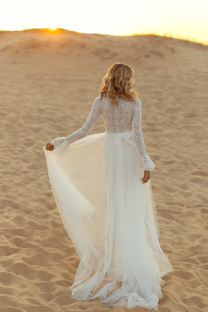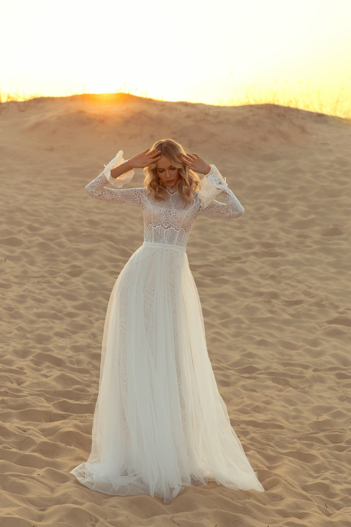 Deze trouwjurk met gesloten top heeft door het bijzondere kant en lange uitlopende mouwen een echte vintage look. De jurk zelf heeft een mermaid silhouet, maar door er een tule overrok aan toe te voegen is het mogelijk om twee verschillende looks te creƫren.