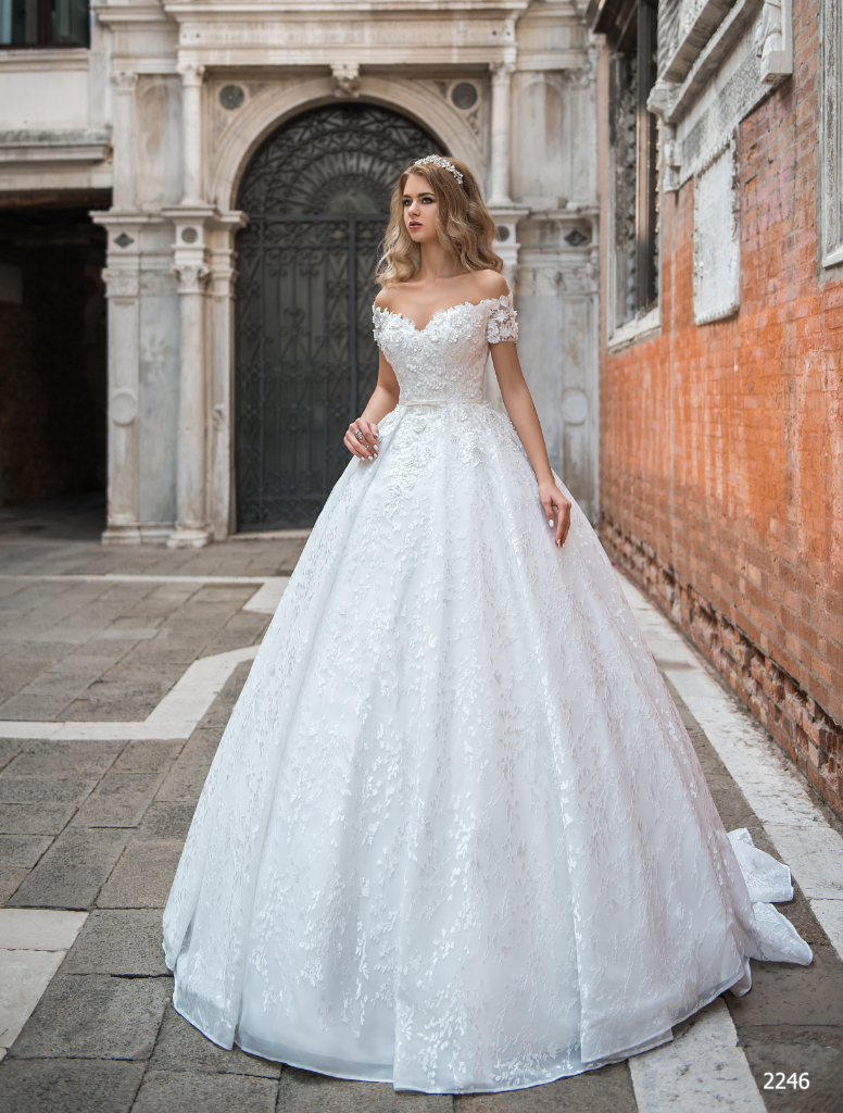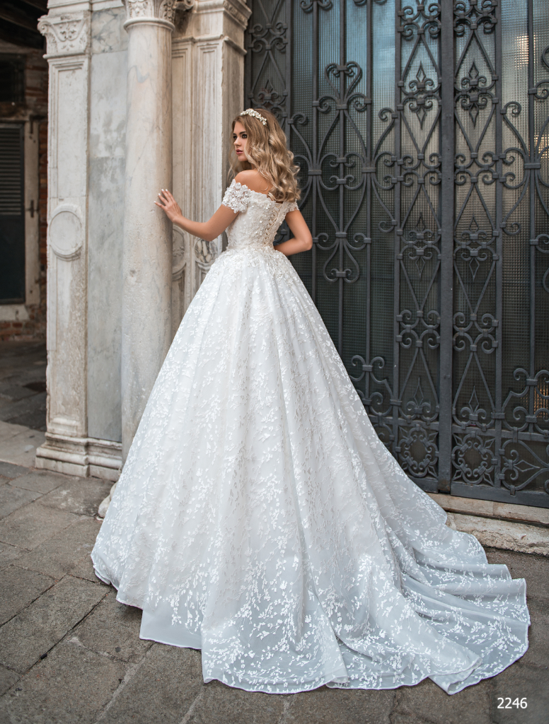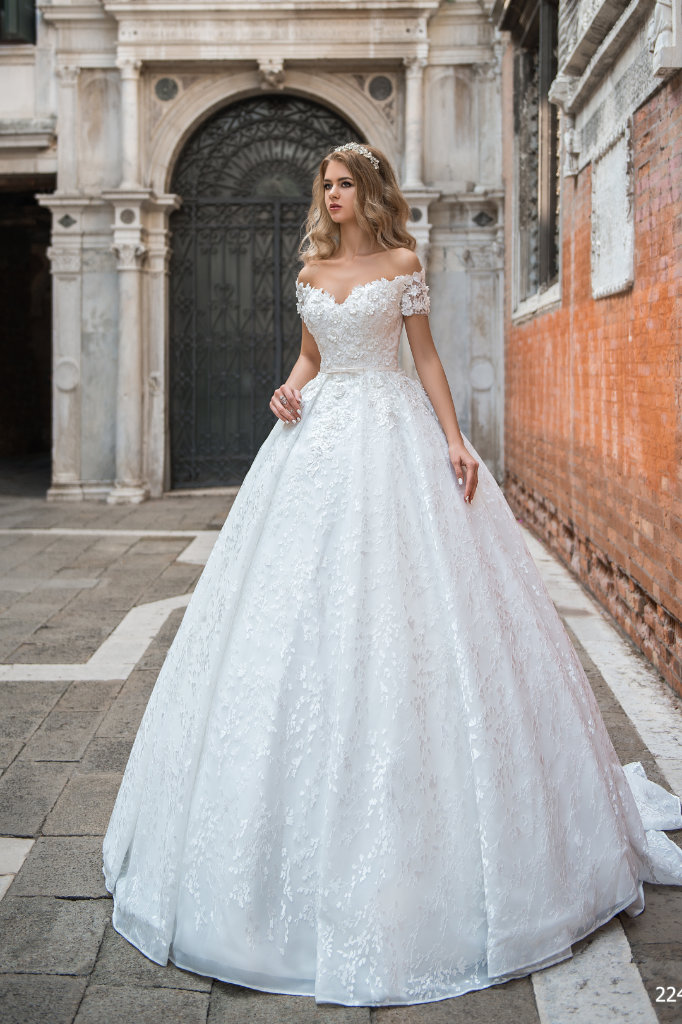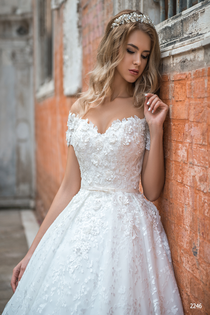 Bij deze trouwjurk is de off shoulder top bedekt met 3D bloemen applicaties die gedeeltelijk overlopen in de rok. De rug heeft een vetersluiting. De wijde tule rok is afgewerkt met glimmende bloemen applicaties.