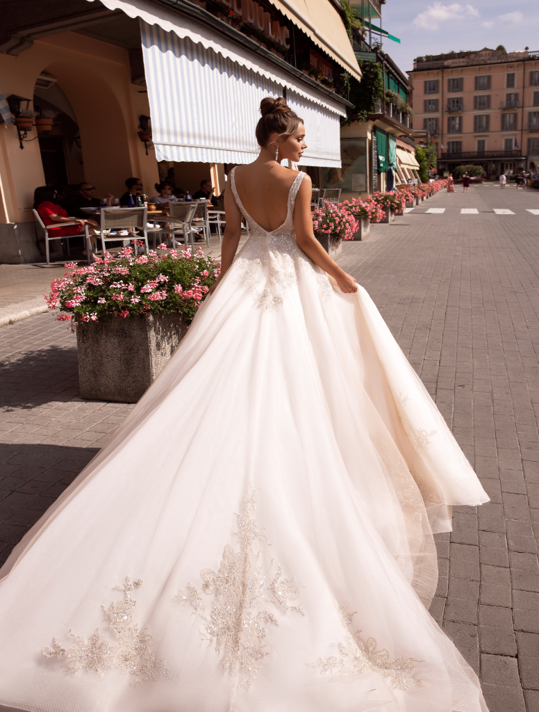 De top met diepe v-hals is bewerkt met bekraald kant welke doorloopt op de diepe v-rug. De bekraling loopt nog gedeeltelijk over in de tule rok. De rok heeft meerdere lagen en een sexy split. Ook de lange sleep is bezet met prachtige bekraling.