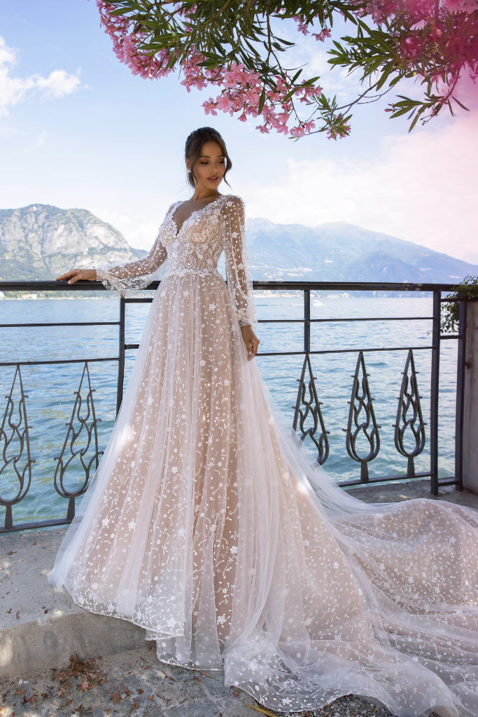 Bij deze jurk heeft de top een sweetheart halslijn en doorzichtige lange mouwen van hetzelfde kant. De diep uitgesneden rug maakt deze romantische trouwjurk net wat pittiger. De rok met meerdere lagen tule heeft een lange sleep.