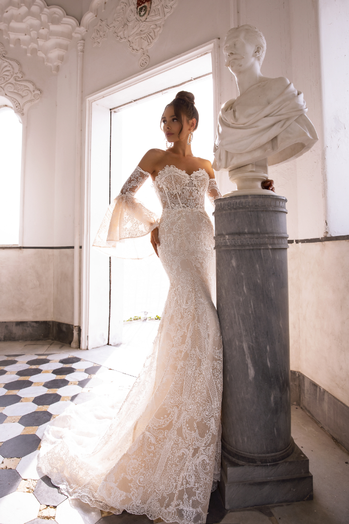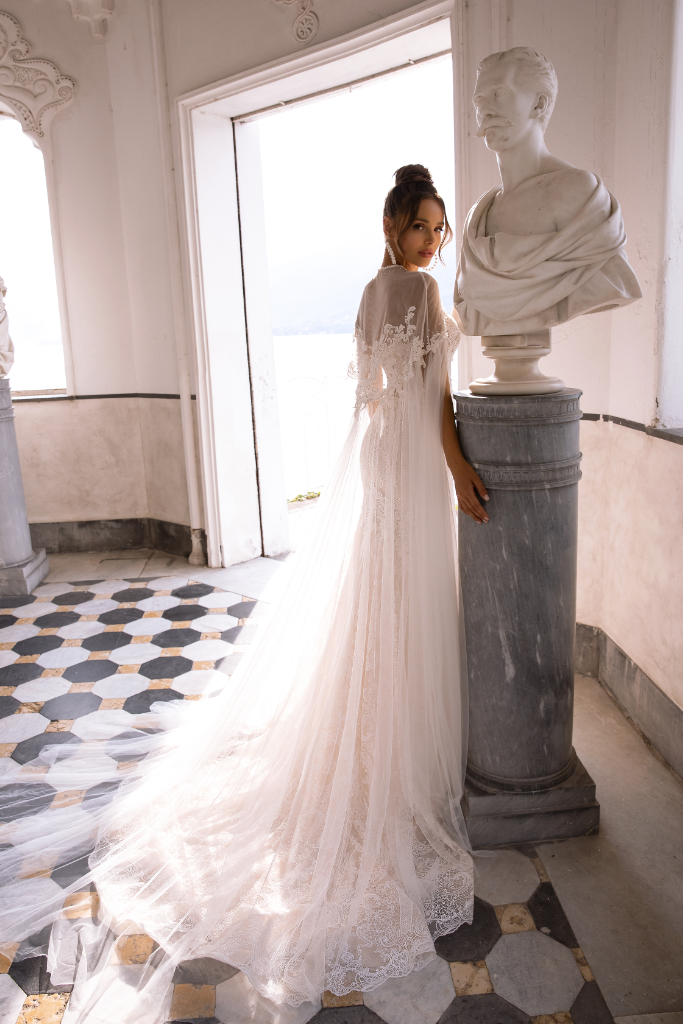 Het semi transparante strapless korset is bewerkt met prachtig kant. De rok is van hetzelfde kant en heeft een korte sleep. Het bijzondere van deze trouwjurk is dat je de look kan afmaken met een prachtige cape of afneembare wijd uitlopende mouwen.