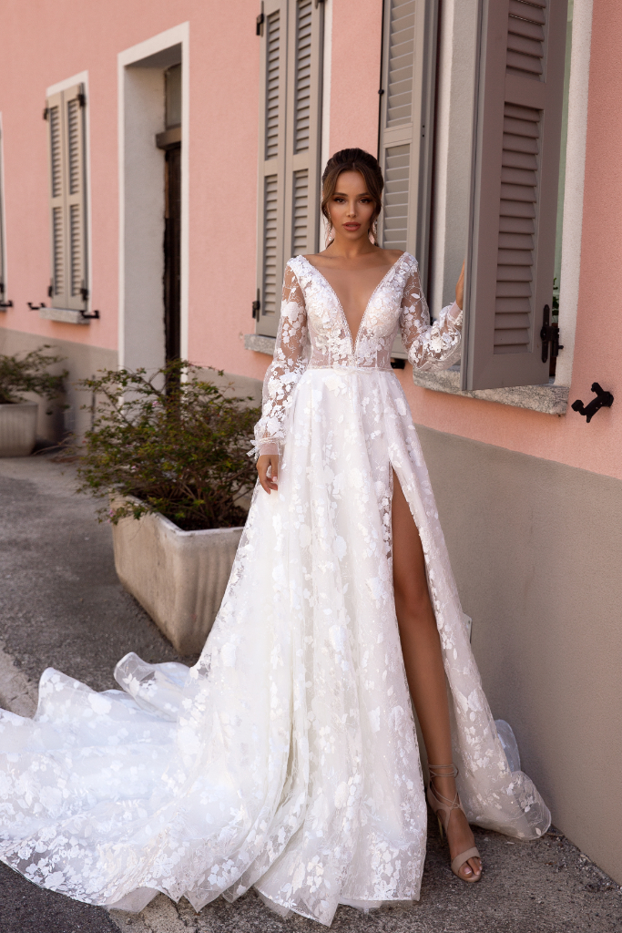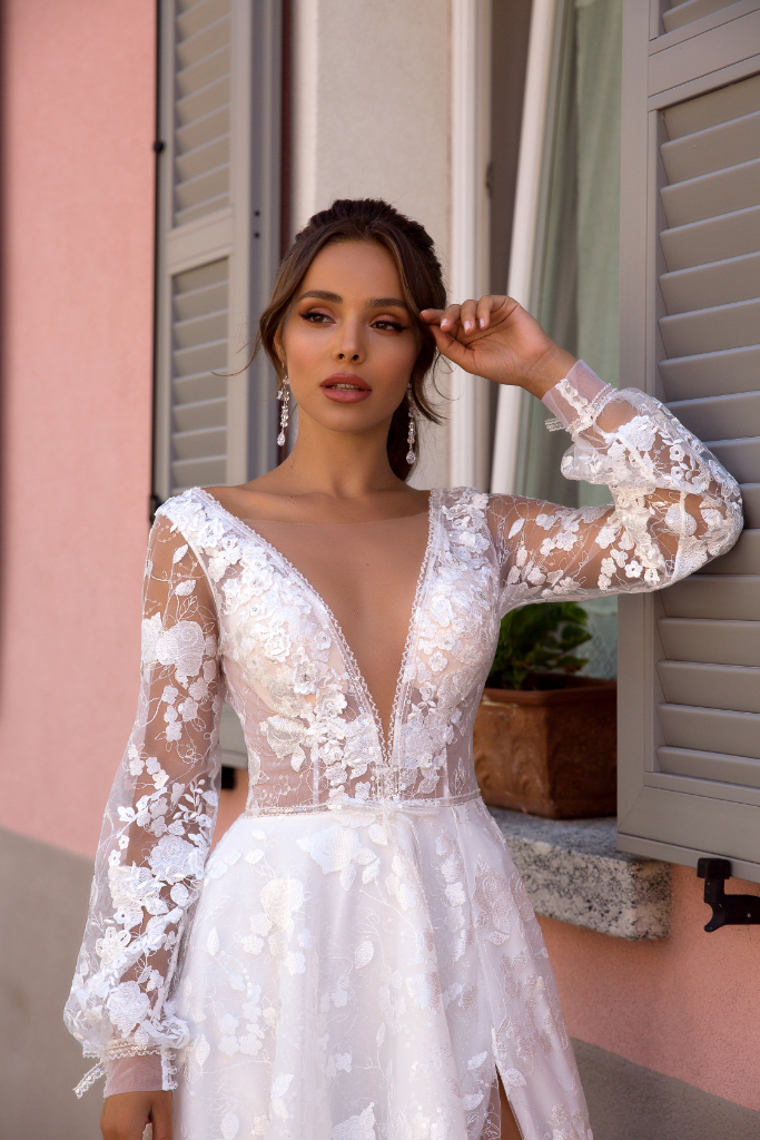 De transparante top met een diepe v-hals is bewerkt met prachtige bloemen applicaties die doorlopen op de doorzichtige lange mouwen én diepe v-rug. De rok heeft meerdere lagen tule waarvan de bovenste laag is bezet met hetzelfde kant als de top. De prachtige sleep én sexy split maken deze trouwjurk helemaal af.