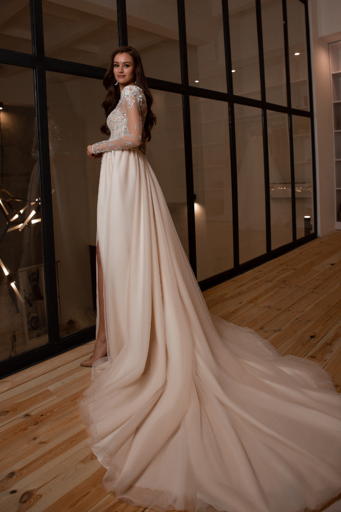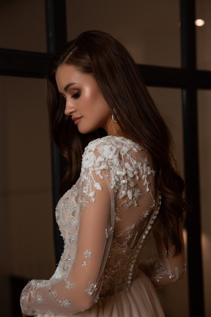 Het strapless korset is bedekt met een transparante stof en de lange mouwen zijn afgewerkt met bloemen applicaties, kraaltjes en pareltjes. De transparante rug met dezelfde applicaties heeft een knoopjessluiting. De rok met split is opgebouwd uit meerdere lagen tule.