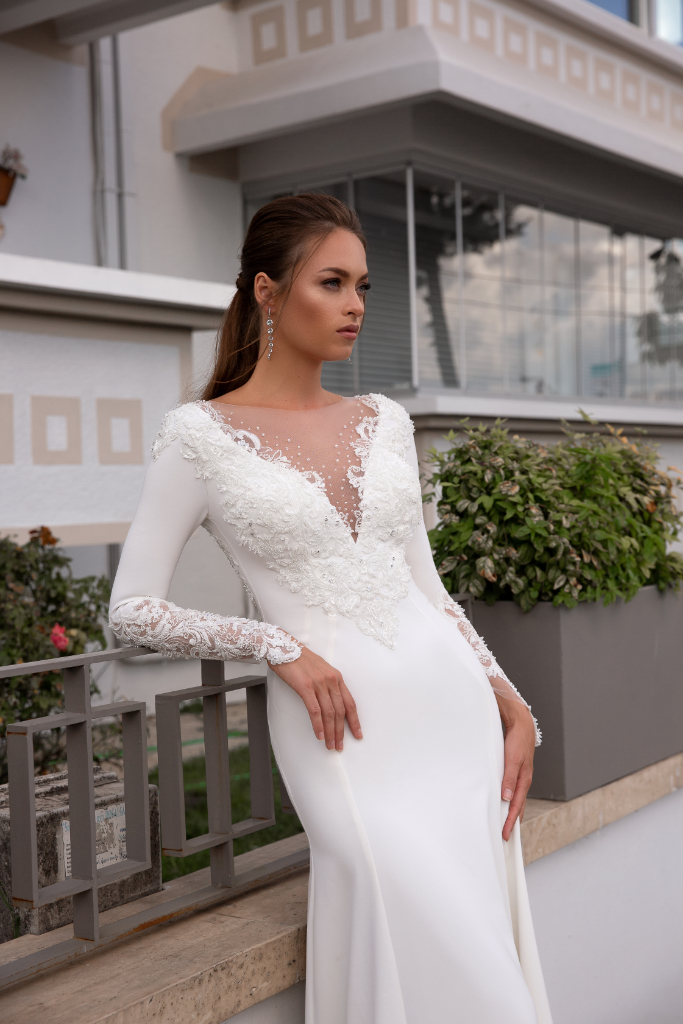 Elegante mermaid trouwjurk met sweetheart halslijn. De top met lange mouwen is bewerkt met prachtige bekraald kant en pareltjes. Het uiteinde van de lange mouwen én de diepe illusion v-rug zijn bewerkt met hetzelfde prachtige kant en pareltjes. De rug én mouwen hebben een knoopjessluiting. De gladde rok loopt vanaf de billen uit in een losse sleep.