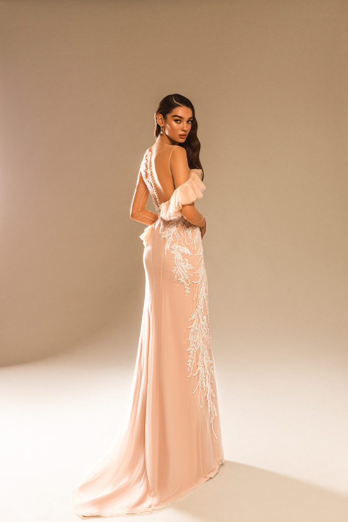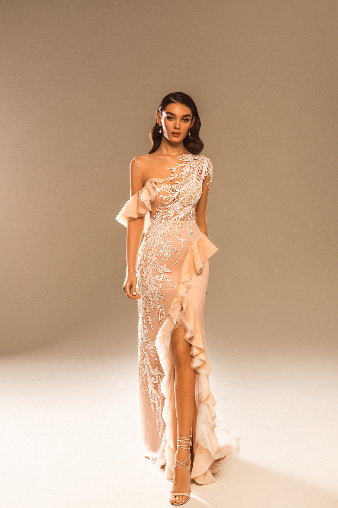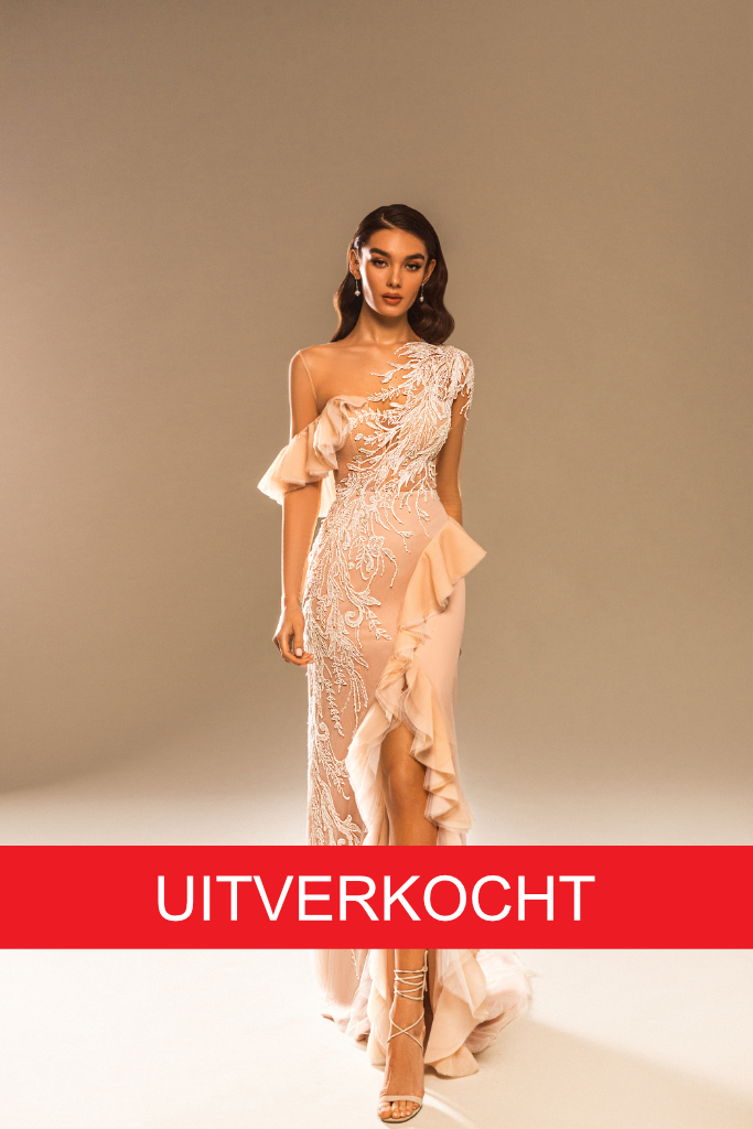 Deze one shoulder top loopt aan de andere kant over naar een off shoulder mouw, waardoor deze jurk heel erg bijzonder wordt. Verder is de top bewerkt met prachtig bekraald kant. De overwegend transparante rug heeft een knoopjessluiting. De ene kant van de rok is bewerkt met hetzelfde bekraald kant als de top. De andere kant heeft een split die afgewerkt is met ruches.