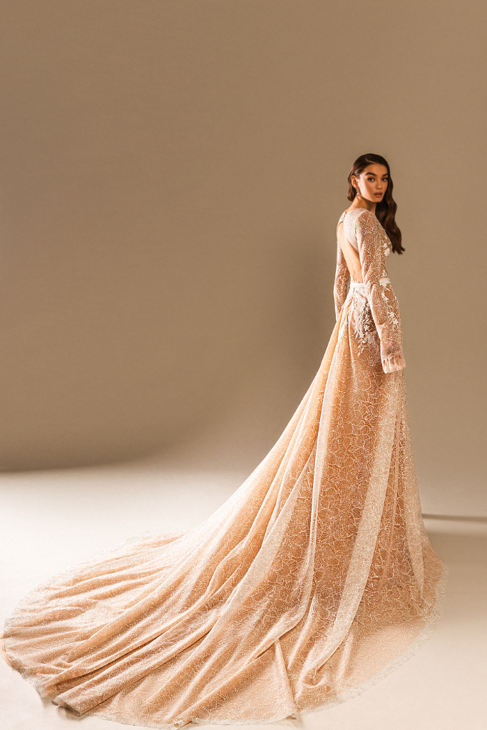 Deze overslag trouwjurk met lange mouwen is gemaakt van prachtig kant en afgewerkt met schitterende bloemen applicaties. De diep uitgesneden rug maakt deze trouwjurk zeer bijzonder. De rok heeft een split en een prachtige lange sleep.