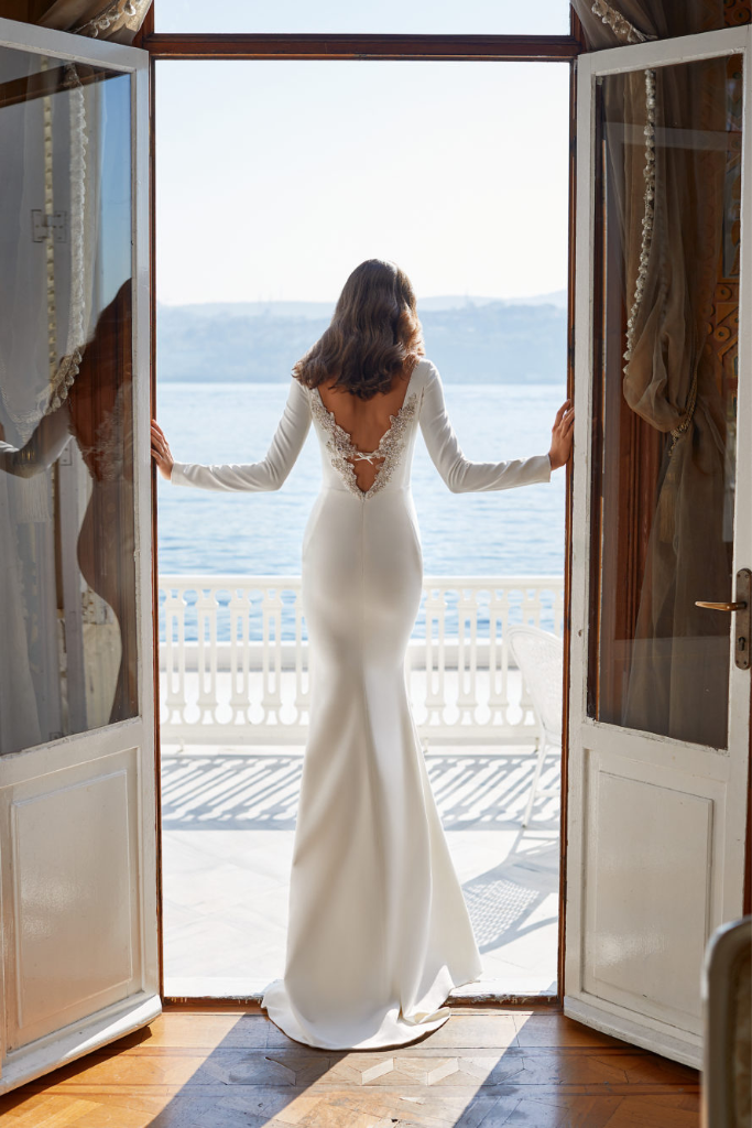 Stijlvolle satijnen trouwjurk met lange mouwen, een boothals en een versierde open rug.